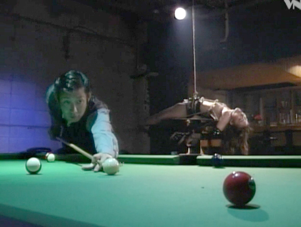 残酷な姿勢に縛られてビリアードのキューで小突かれる女、舞子。